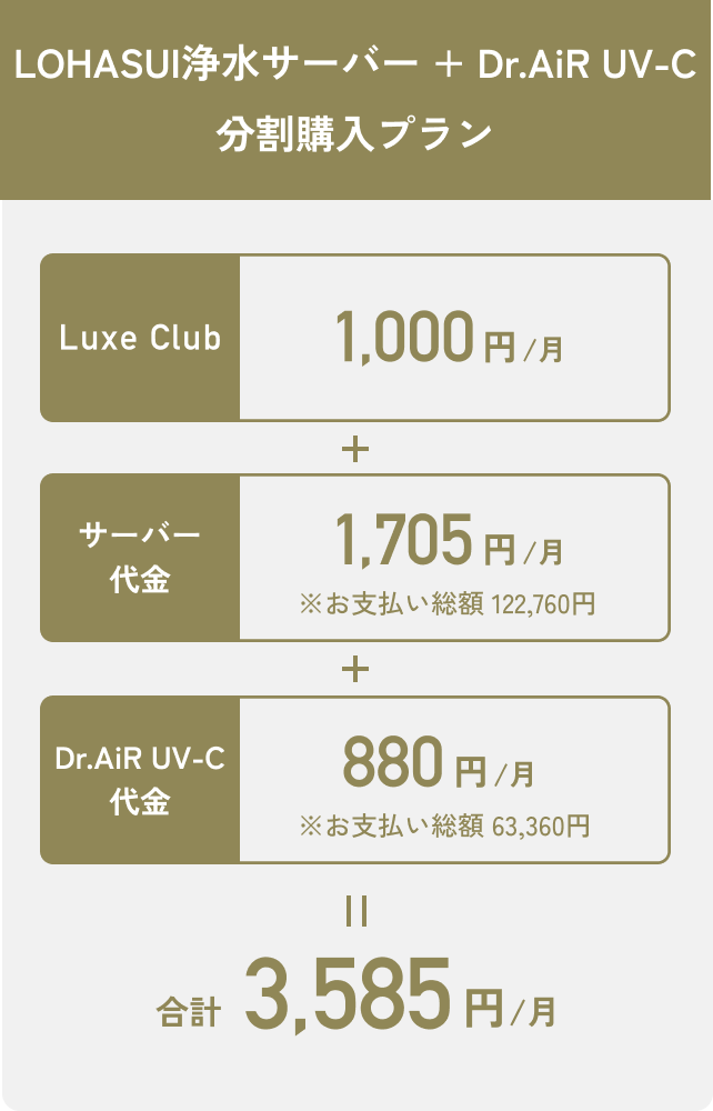 LOHASUI Luxe(浄水型ウォーターサーバー)とDr.AiR UV-C(ウイルス・ワンパス除去装置)のセットでお使い頂けます。