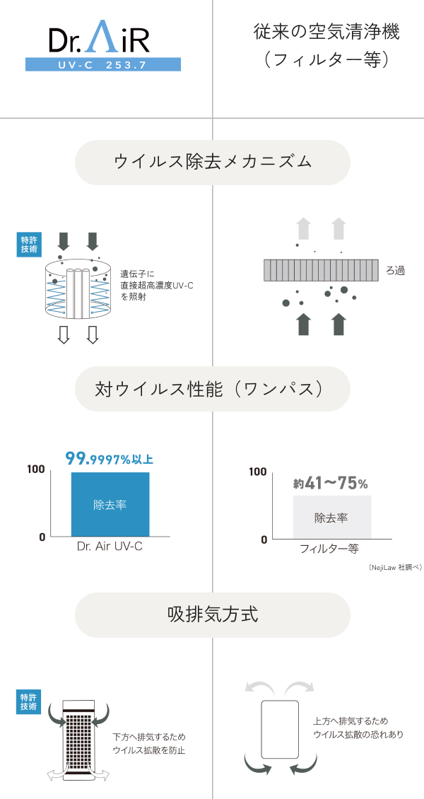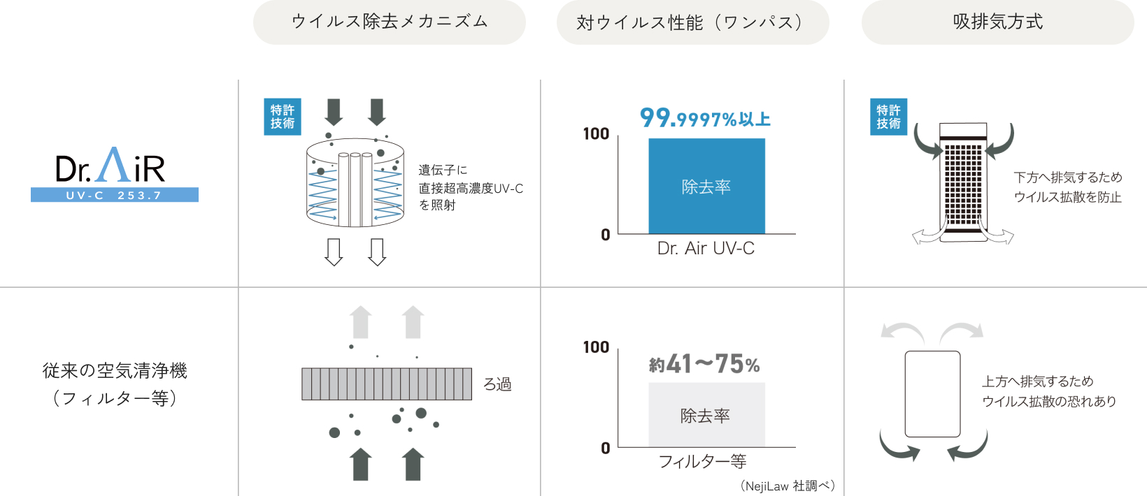 今までのフィルター式の空気清浄機では取りきれなかったウイルスを、Dr.AiR UV-CはNejiLaw社グループの特許技術により、深紫外線を従来のUV-C照射方式の約1000倍に増幅させることで超高濃度深紫外線空間を作り出し、この空間にウイルスや細菌類を含んだ空気を通過させる事で、ウイルスや細菌の遺伝子に対して99.9997%以上の除去性能を実現しています。